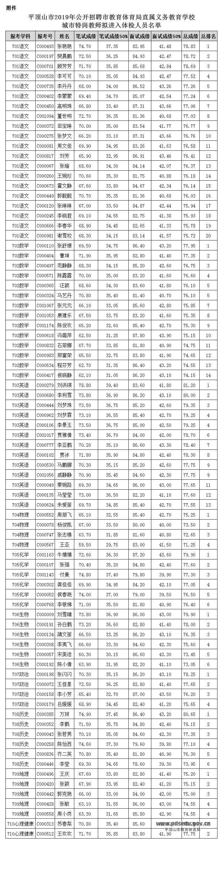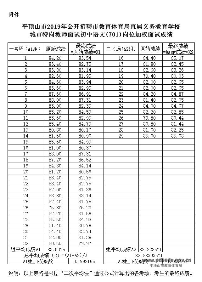 关于公布平顶山市2019年公开招聘市教育体育局直属义务教育学校城市特岗教师面试语文学科面试加权成绩的通知