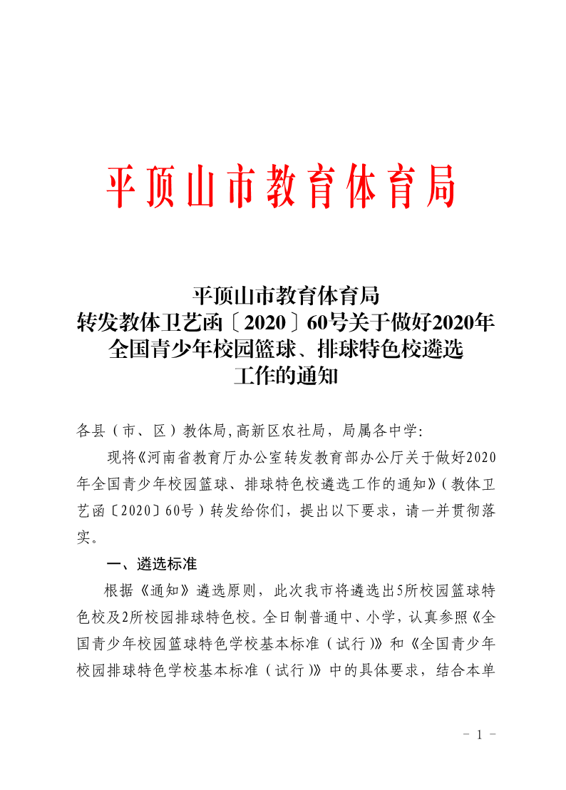 平顶山市教育体育局转发教体卫艺函〔2020〕60号关于做好2020年全国青少年校园篮球、排球特色校遴选工作的通知