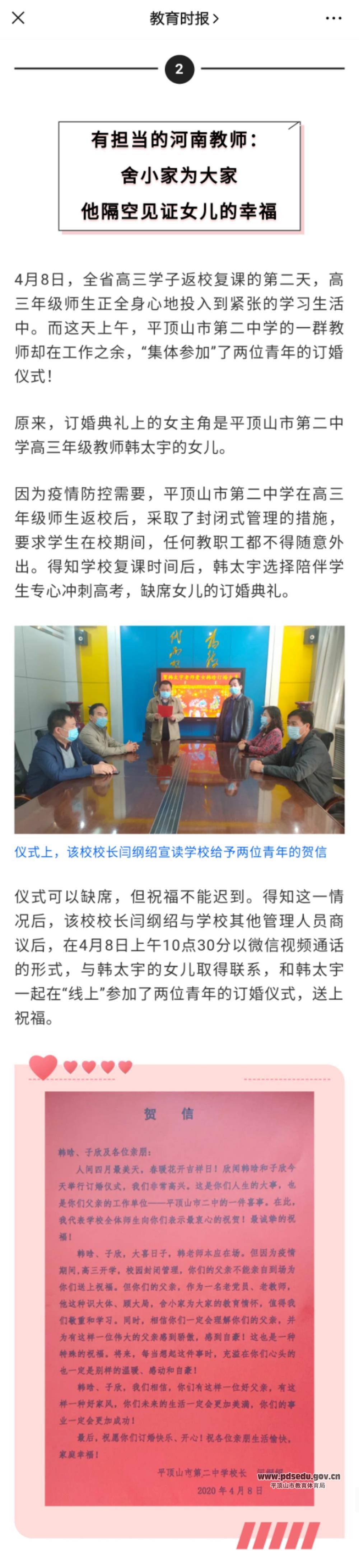 《教育时报》:有担当的河南教师:舍小家为大家 他隔空见证女儿的幸福