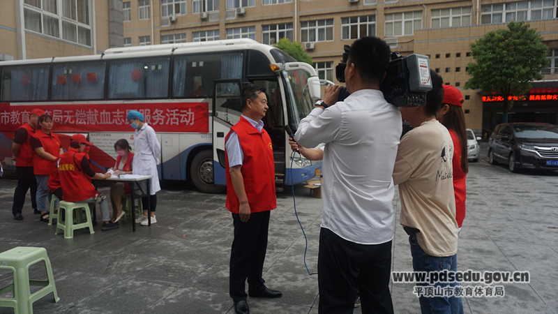 平顶山市电视台对本次活动进行了现场采访,市教体局党组成员、副局长郭志勇接受采访时谈到:“‘无偿献血无限光荣’已成为广泛的社会共识,希望通过市教体局干部职工的实际行动,能够带动更多的人加入到无偿献血的队伍中来,发扬中华民族扶危济困、协作互助的优良传统,倡导守望相助、共度时艰的人际关系,弘扬共筑美好生活梦想的时代新风,为助力保障抗疫期间临床用血和急救用血,推动我市全国文明城市建设、坚决打赢疫情防控阻击战贡献力量。”