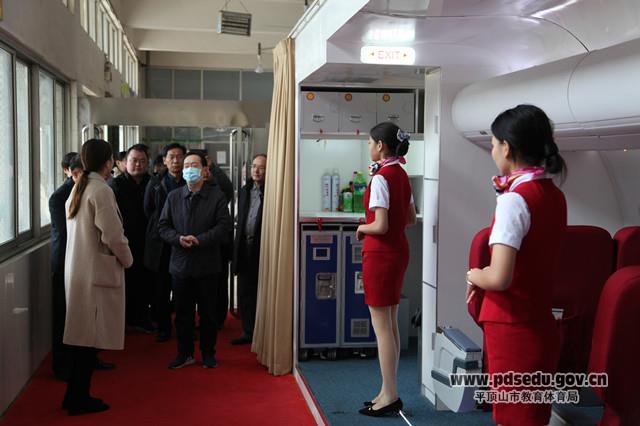 此外,工作组还察看了学校航空服务和城市轨道管理与服务两个专业的实训室——航空模拟仓,现场听取了马庆业及相关人员对这两个专业建设和发展的介绍。