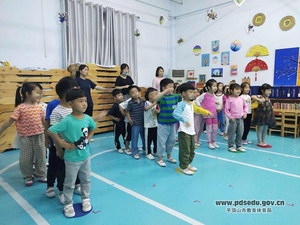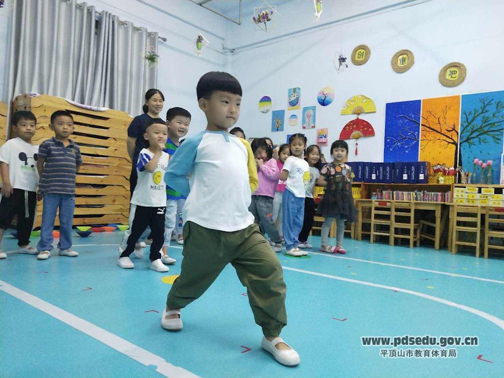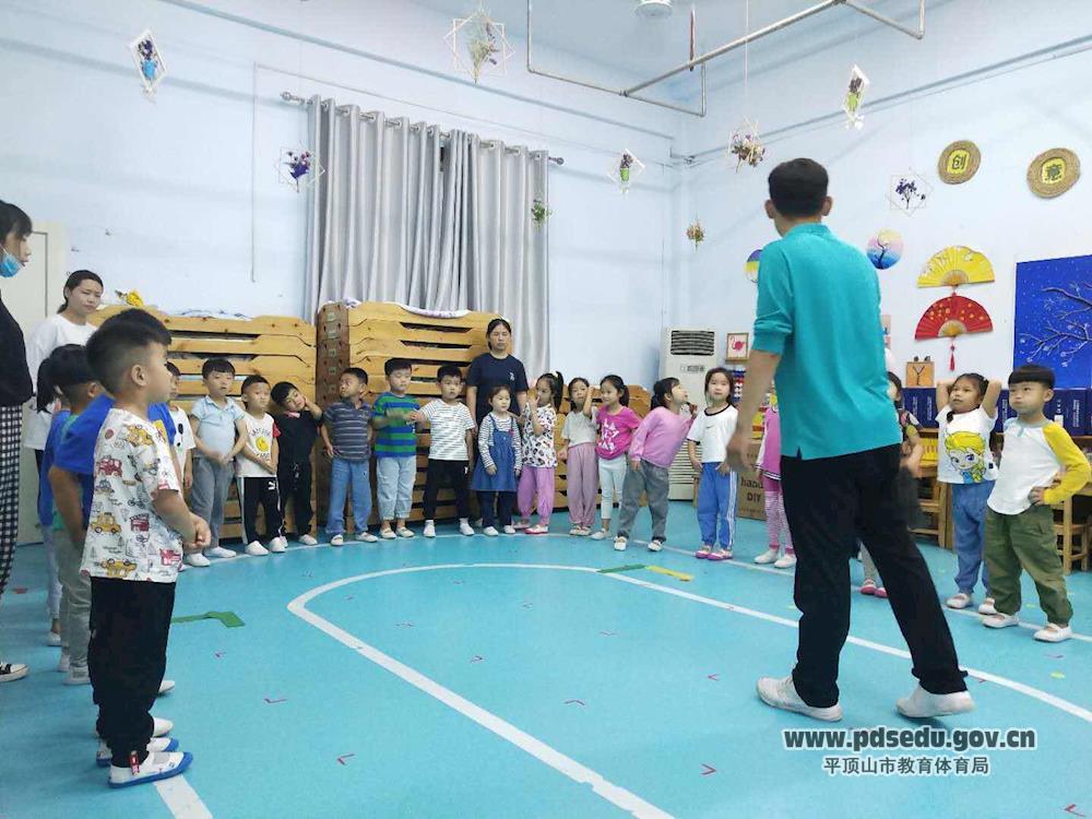 热身后开始学习这节课的重点,先简化用网球拍打球的难度,通过用手操控物体及眼和脚的协调配合来进行网球启蒙。既减低了网球的学习门槛,又锻炼了小朋友手、眼、脚相互配合以及操控物体击球的能力。教练邀请教师进行配合示范后,开始了学习、练习及分组比赛的三部曲,并引导学生进行认知训练,通过说话来进行自我反馈,什么时候该做什么及是否做到,并进行自我反馈,培养学生主动思考,积极训练的意识。