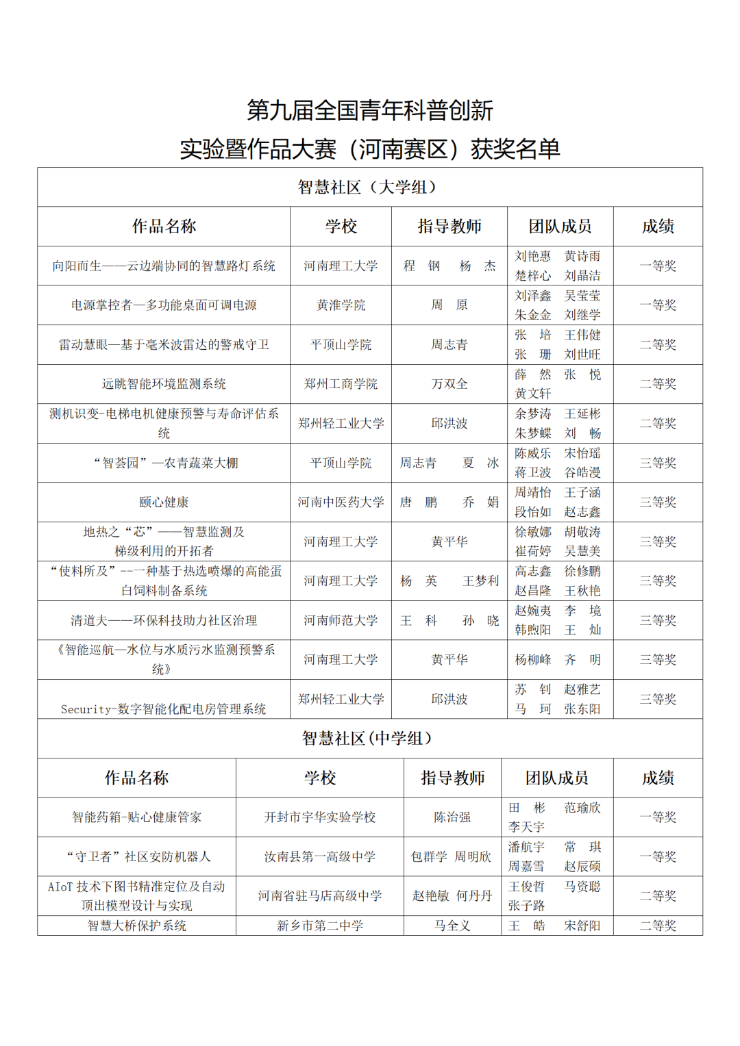 | 繁体 | 网站已支持ipv6由河南省科协主办、河南省科技馆承办的第九届全国青年科普创新实验暨作品大赛(河南赛区)复赛已于2023年5月25日圆满结束。经过初赛、复赛两轮评审,智慧社区命题大学组评出一等奖2组,二等奖3组,三等奖7组;智慧社区命题中学组评出一等奖2组,二等奖3组,三等奖5组;未来太空车命题评出一等奖2组,二等奖3组,三等奖5组;此外,评出优秀组织单位10个,优秀指导教师奖57名。具体获奖名单如下: