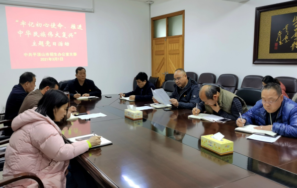 3月1日上午市招办举行“牢记初心使命、推进中华民族伟大复兴”主题党日活动。招办全体党员准时参加了此次活动。活动由张爱民副主任主持,全体党员面向国旗合唱国歌;张爱民副主任领誓,全体党员面向党旗重温入党誓词;缴纳了三月份党费。