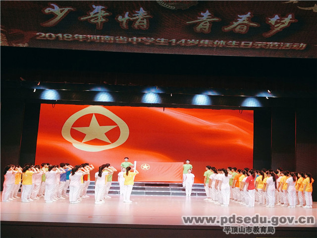 河南省中小学生14岁集体生日示范活动于2018年11月27日在平顶山市艺术中心厅举行。此次活动以“少年情·青春梦”为主题,旨在贯彻落实团中央“学习总书记讲话,做合格共青团员”主题教育实践要求,进一步引导广大中学生践行团员先进性,引导学生珍惜青春年华,系好人生第一枚纽扣。这是一次高水平、高质量的盛会,更是该校创建“以艺促成”特色学校的成果展示。从活动准备伊始到最终完美谢幕,在历时一个多月的筹备排练与最终演出过程中,校领导高度重视,参演师生认真对待,细抠每一个演出动作与细节,不叫一声苦,不喊一声累,显现出了吃苦耐劳的良好精神风貌以及高质量的演出水准。