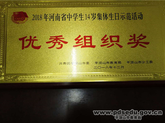 日前,由共青团平顶山市委、平顶山市教育局、平顶山市少工委联合组织印发的《关于表彰2018年河南省中学生14岁集体生日示范活动优秀单位和个人的决定》中,市三高与该校参演老师荣获优秀组织奖及优秀个人奖。