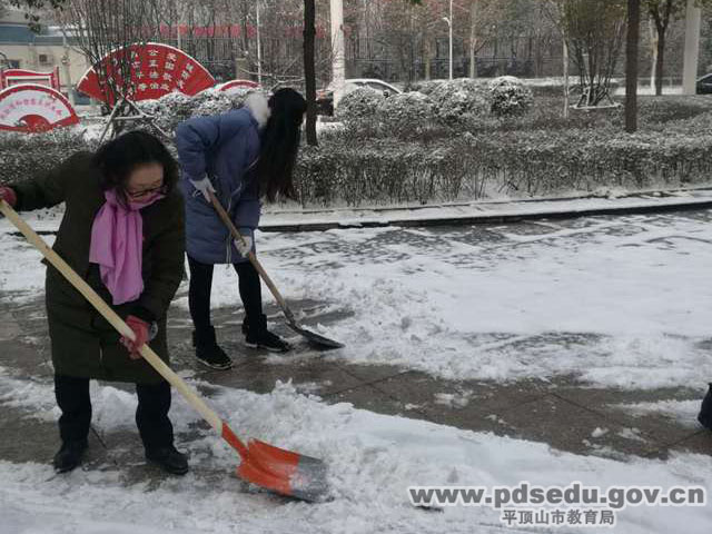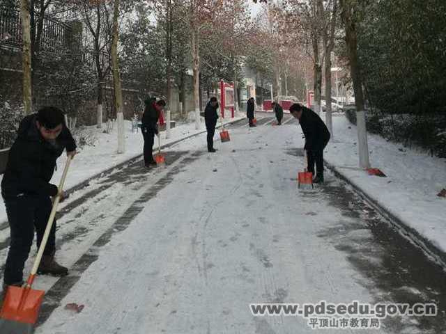 为了减少事故的发生,平顶山一中附属初中党支部,及时组织没课的教职工及党员开展铲雪活动。校长王东辉亲临一线,参与的同志个个干劲冲天,激情飞扬,给冬日的寒冷增添了无限的温暖。经过老师们的努力,学生们放学经过的主要道路上的积雪被铲除,为学生们提供了安全通道。