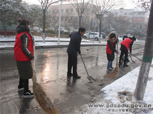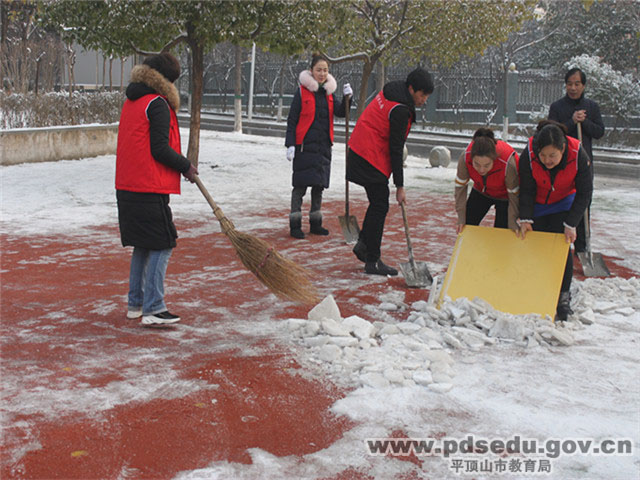 1月10日清晨,湖光幼儿园党员志愿者走进社区清扫积雪,教师们带着铁锹、大扫帚纷纷投入到扫雪的活动中。突降的大雪,给平顶山带来银装素裹的美景,但同时也给人们的出行带来不便和安全隐患。天特别冷,但参加扫雪的老师们,不畏天寒,不惧地冻,铁锹铲、扫帚推、扫,干得热火朝天,将社区主要通道和幼儿园内公共活动区域厚厚的积雪集中堆放,出行的通道清理得干干净净。