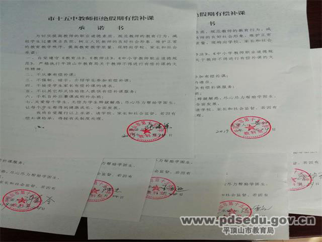 在2018学年全体教工会议上,该校副校长陈全岭宣读学习教育体育局关于拒绝假期有偿补课的通知,全体教职工签订承诺书。