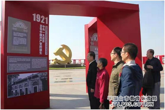 在领导和学校后勤工作人员的陪同下,老教师们在市民广场步行欣赏广场风景和党建文化。在广场正中央,由中共平顶山市委新城区党工部举办的“奋斗百年路,启航新征程”暨建党100周年党史展览引人瞩目。硕大的党徽屹立在广场正中央,周围的党史长廊上,重要历史事件按年份排列,举目望去,整个党史文化长廊写满了党的艰辛历史和重要成绩。扑面而来历史厚重感,让人感到没有中国共产党的领导,就没有今天来之不易的幸福生活。全体党员在党旗下重温入党誓词,掷地有声的誓词里包含着党员教师对党的忠诚,对党的热爱。