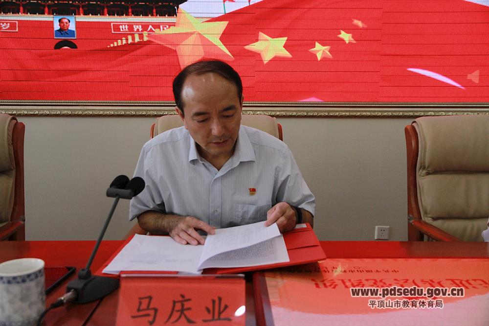 机关党委委员、市财经学校党委副书记、校长马庆业宣读《中共平顶山市教育体育局党组关于表彰2020年优秀共产党员、优秀党务工作者和先进基层党组织的决定》。