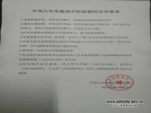 积极响应上级部门的工作要求,市实验高中制定了严格的校园出入登记制度,要求所有人员出入学校必须佩戴口罩;教职工无特殊情况,居家休息。紧随其后,又制定了详细的防疫期间安全要求,对全校教职工和学生进行了严密的出行动向情况排查,争取及时发现疫情隐患,对于有从疫区回来的或者和从疫区回来人员有密切接触的人员,安排专门负责老师每天询问身体情况。
