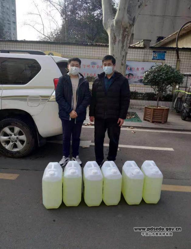 2月10日下午,市三高高一6班学生盛洁的家长,为学校捐赠300斤次氯酸钠消毒液。2月11日,高一6班学生安莹春家长,向学校捐赠100斤医用酒精。