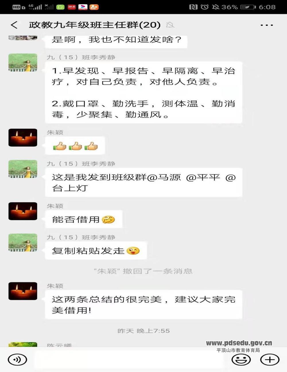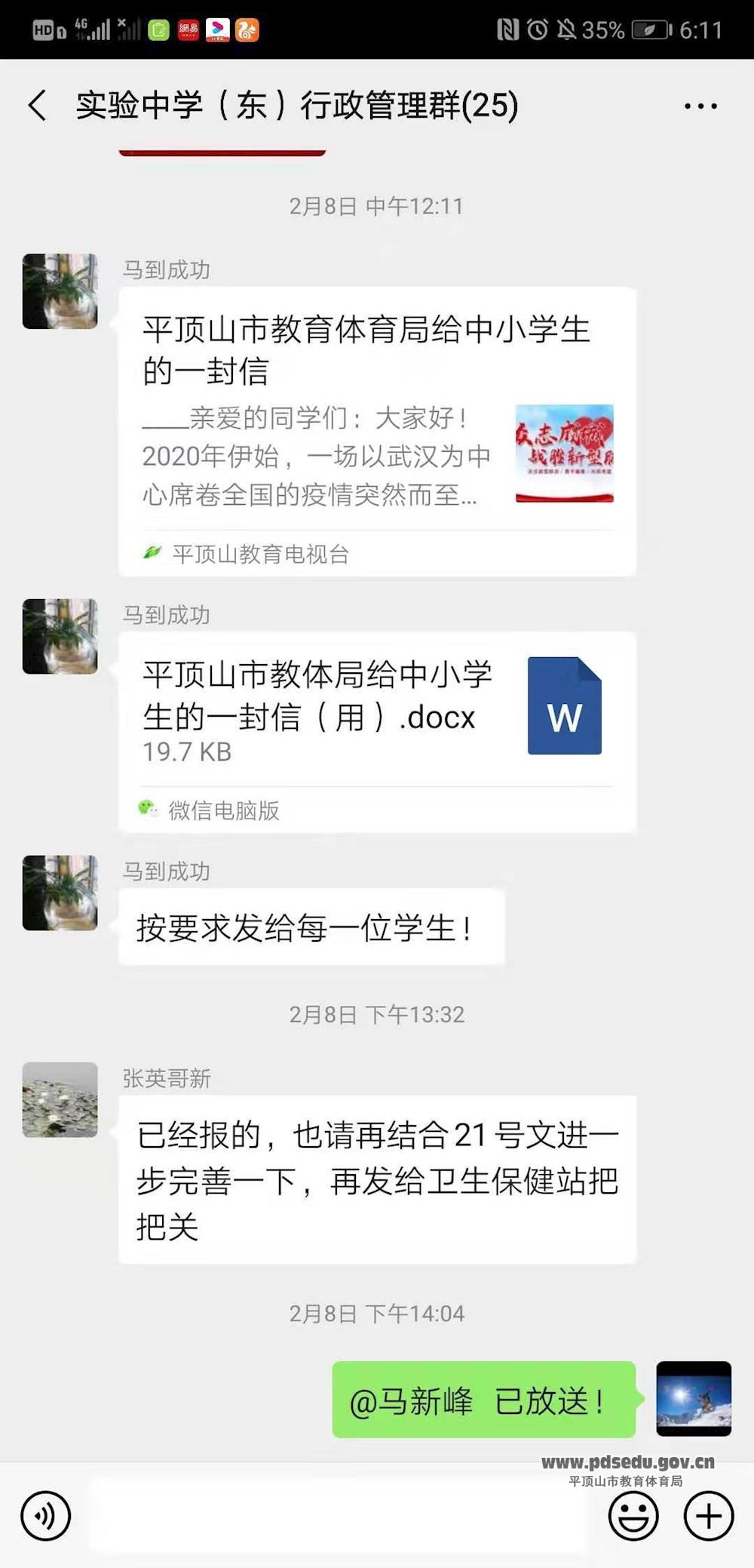 政教处快速拟定各项有关疫情防控的上报制度,通过班主任群、全体教师群、班级家长群等及时下发抗疫防控通知。制定各班学生每日情况汇报表,微信群学生每日健康打卡,通过钉钉平台设置家长沟通群,切实有效地开展抗疫防控工作,及时把握全校学生及家长的健康情况。