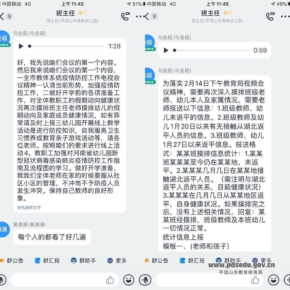 二是对教育教学工作进行再安排再部署。按照市教体局疫情防控工作会议精神,幼儿园致力于探究“停课不停学”新教学模式。要求班级教师充分利用微信、钉钉等平台制作通俗易懂宣传防疫知识、卫生知识和寓教于乐居家亲子游戏等内容。
