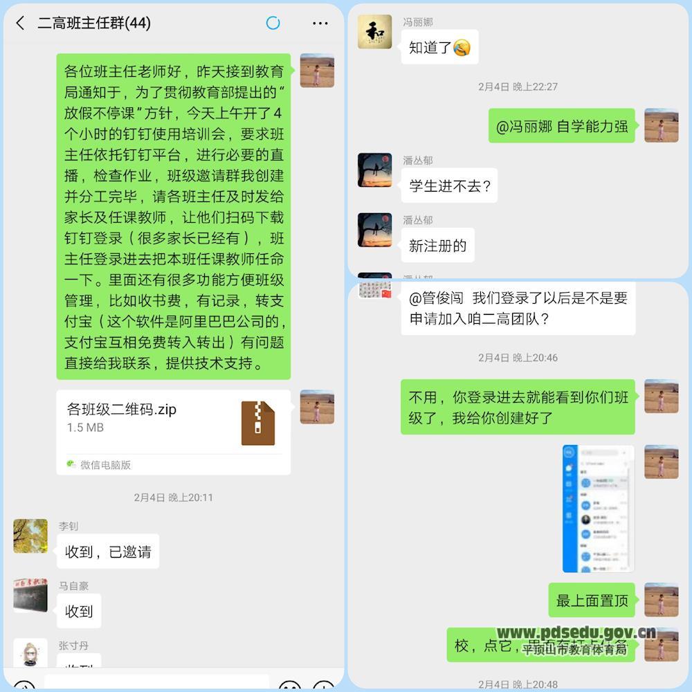 2月3日,接教体局信息中心通知,积极组织全体教师参加钉钉平台全员线上培训。2月4日上午,学校钉钉管理员管俊闯参加线上培训,一直开会到12点半;2月4日下午就开始搭建学校组织架构,进行学校组织架构导入,并设置好班主任、教师的班级对应表,一直忙到晚上半夜。2月5日下午通过群直播方式,组织对班主任及全体教师进行在线培训,帮助老师们认真的学习钉钉直播技术。