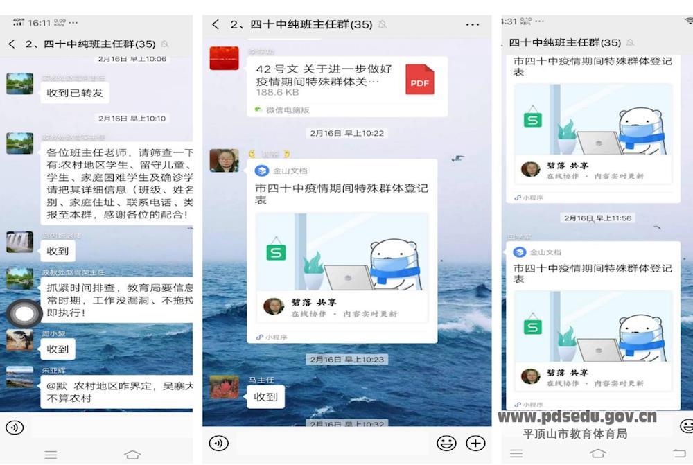 市四十中地处平顶山市城乡结合部,学校农村地区学生,尤其是留守儿童、残疾学生、家庭困难学生占比重比较大,为真正落实好局党组的指示精神,学校组织各班级通过微信群、钉钉群、校信通等方式筛查学生信息。班主任和任课老师通过视频、电话、微信等方式加强交流沟通,了解学生需求,为其提供个别化生活和学习指导服务。