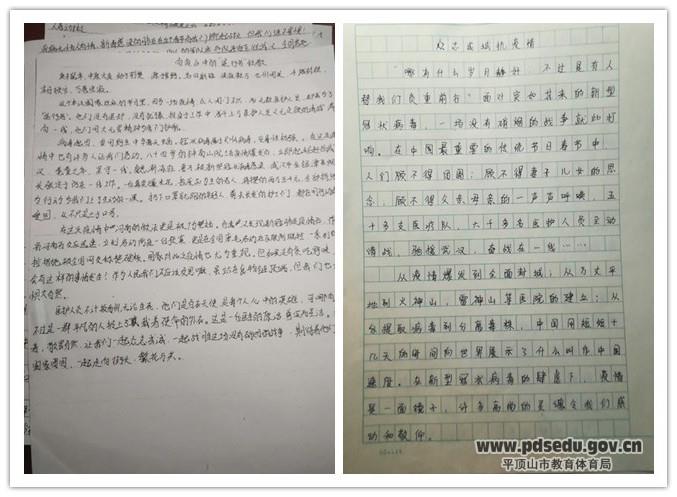 七(1)班周子涵同学写道:面对病毒你们勇敢地站出来,与之斗争,完全不顾个人的安危,冲在抗击病毒的第一线,你们舍小家为大家,远离亲人,为你们的奉献精神,我点一个大大的赞。你们一定要注意自己的身体,保护好自身的安全,我是一名普通的初中学生,我会响应国家的号召,老老实实地待在家里,不去人员密集的场所,不给你们添麻烦,我会时刻地关注新闻,关注你们,我会在心里为你们默默的祈祷,祝你们早日凯旋。