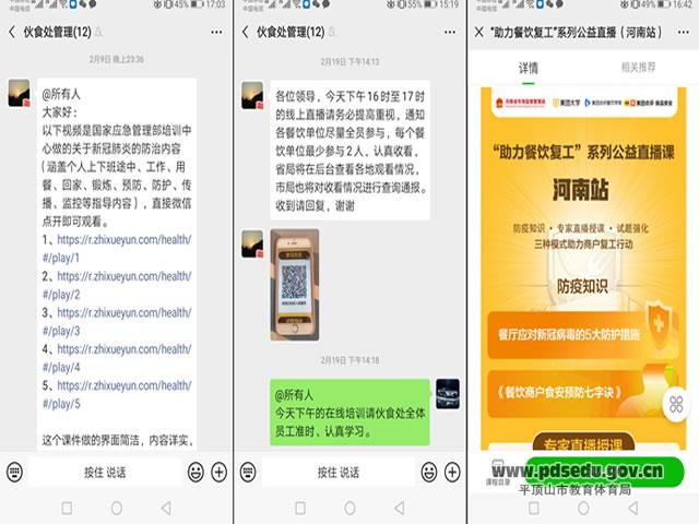 停工不停学,积极学防控。伙食处全体教职员工利用电视、电脑、手机等媒体认真学习疫情相关知识,并于2月19日下午通过“专家线上直播”,组织员工加入直播间,在线观看和学习刘成章博士的《餐饮企业在新型冠状病毒流行期间的防控指南》,了解科学防控。