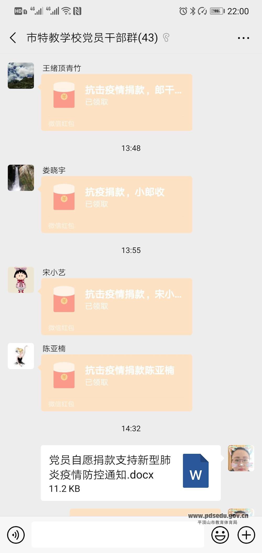 本次活动坚持“捐赠自愿、量力而行”的原则,捐款途径不采取现场捐款,而是通过在学校党员微信群中发送捐款红包的方式捐款。学校领导积极带头,短短2个小时内,有36名党员捐款献爱心,共募集资金 3566元,助力疫情防控。