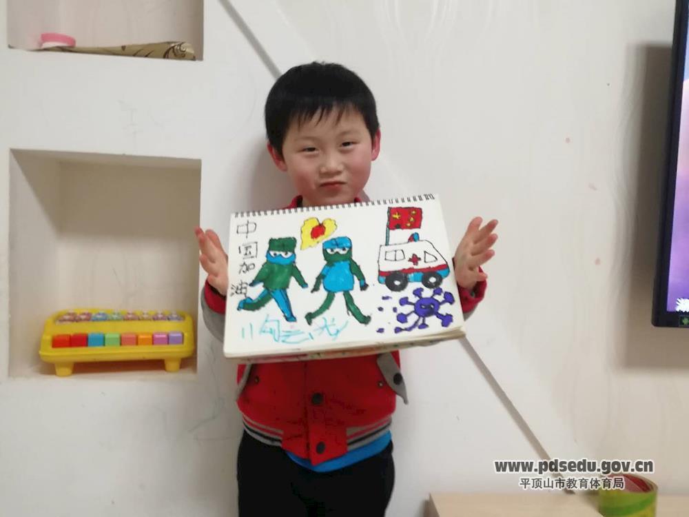 各班教师通过班级钉钉群、微信群、视频在线指导等多种方式,引导家长在家指导幼儿创作各种祝福作品。“中国加油”“抗战病毒”“抗击疫情从我做起”参与活动的萌宝们用手中的画笔,创作出一幅幅充满爱心的画作致敬最美“逆行者”;用稚嫩的童声说出“祖国加油、武汉加油”;用优美的歌声为疫情防控加油助力。