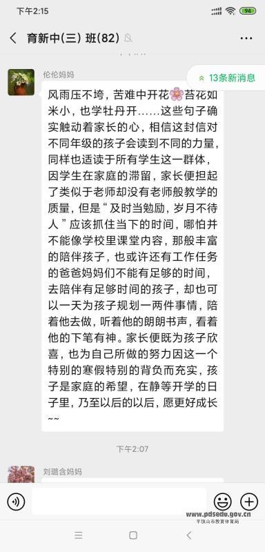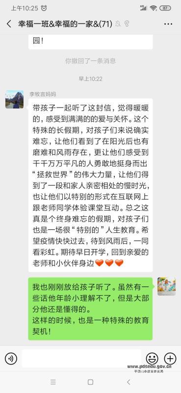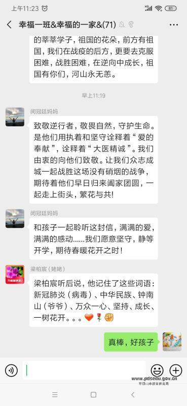 在此次活动中,各班老师利用班级钉钉群向家长发布学习内容,并将学习心得在群内共享。小二班家长表示:疫情当下, 国难当头, 与每一个人都息息相关, 也是每一个人逆向成长为国之栋梁的苦口良药。中三班的家长表示:冬已尽,春可期,待来日战胜疫情后,要不负韶华,读书报国!大一班的家长表示:和孩子一起聆听这封信,满满的爱,满满的感动,我们愿意坚守,静等开学,期待春暖花开之时……。