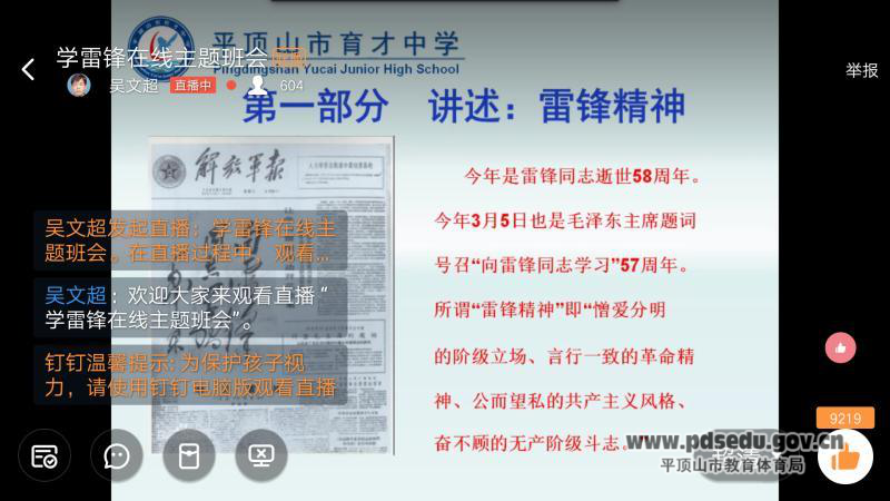 吴文超讲到:同学们,三月是“雷锋月”,根据学校“雷锋月”活动安排要求,我们今天召开一次特别的线上主题班会。在这个特殊的寒假,新型冠状病毒肆虐中华大地。疫情发生以来,成千上万的志愿者奔赴在一线,无数英雄事迹感动着我们,这些勇敢的逆行者践行着“雷锋精神”,他们传递着信念的能量、大爱的胸怀、忘我的精神、进取的锐气,这也正是我们中华民族精神的最好写照。我们应该积极学习战疫一线人员的雷锋精神,激励自己的同时也将正能量传递给别人。