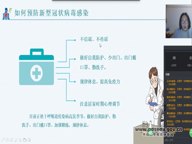 | 繁体 | 网站已支持ipv6随着新冠肺炎疫情的蔓延,学生宅在家中已一个多月,幽闭的环境、单调的生活和学习的压力等,使一部分同学产生了焦躁的心理。为了帮同学们进一步掌握疫情防控知识,也为了缓解同学们的压力和焦虑,让大家更好地宅其身、习其业、修其行,自3月5至3月8日,平顶山市四中组织开展了新一轮疫情防控知识网络主题班会。