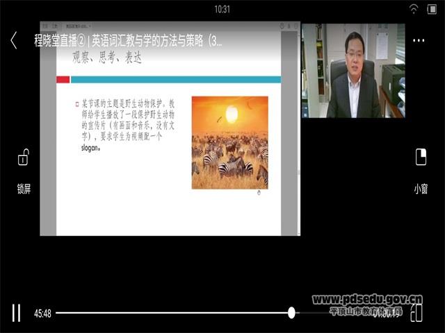 首先,名师工作室主持人刘燕慧组织全体成员在线共同观看北京师范大学外国语言文学院教授、博士生导师程晓堂教授的直播讲座--英语词汇教与学的方法与策略。随后,工作室成员在线分享教学感悟及今后教学中切实可行的方式方法。