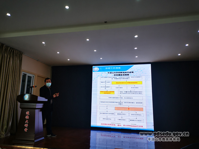 按照疫情期间会议要求,学校办公室人员会前对报告厅进行了通风和消毒,与会人员全部佩戴口罩、分散坐开。