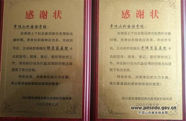 | 繁体 | 网站已支持ipv63月21日上午,平顶山外国语学校收到了两块沉甸甸的感谢状。这是外国语学校所在辖区汝州市风穴路街道新冠肺炎疫情防控指挥部为感谢学校的两个家属院卡点在疫情防控工作中做出的突出贡献,为辖区打赢疫情防控阻击战提供大力支援而专门通过快递邮寄过来的。