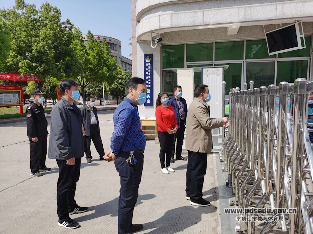 由于疫情防控的需要,学校实行“不出不进”封闭式管理。外来人员一律不准进入校园。湛河区纪委领导来到二中,首先了解了学校的外围环境及周边安全状况,接着,站在学校电动门前听取了闫纲绍校长对学校开学以来封闭管理及教育教学工作情况的汇报。