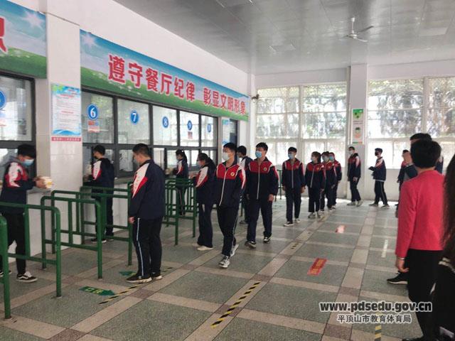 疫情期间,食堂就餐实行错时段、分批同向就座用餐方案。学校食堂免费为每一个就餐学生提供一次性环保餐具。制定了学生就餐流程图,洗手池配备洗手液,并在醒目位置张贴有“七步洗手法图示”,要求学生餐前餐后按照正确的洗手方法洗手消毒,班主任全程参与,为学生饮食安全保驾护航。