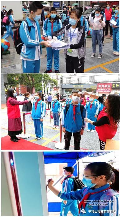 7:30到7:50,五、六年级的同学们错峰到达校门口,在入校前他们前后间隔1米,完成健康卡和健康承诺书核验后,在老师的指引下,有序地完成体温监测,按照规定路线进入教学楼。