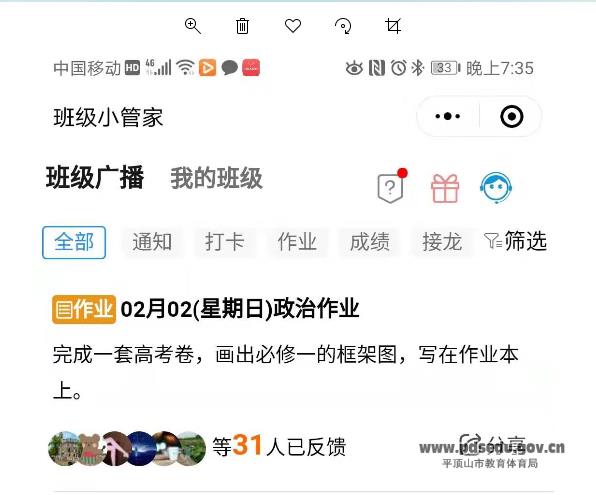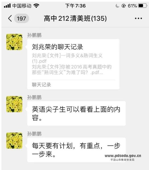 再次,各班班主任主动担当,守土尽责。各班班主任组建由班主任为群主的临时学习微信群和QQ群,成员由本班任课老师和本班学生家长组成,每天晚上21点之前由学生家长协助检查学生当天作业完成情况,并拍照发进群里。各班班主任依据每日学习计划,随机抽查学生自主学习情况,以电话家访的形式和家长所发的视频为主要依据。同时,密切关注学生健康状况,做好新型冠状病毒感染的肺炎疫情的防控宣传工作,不信谣,不传谣。