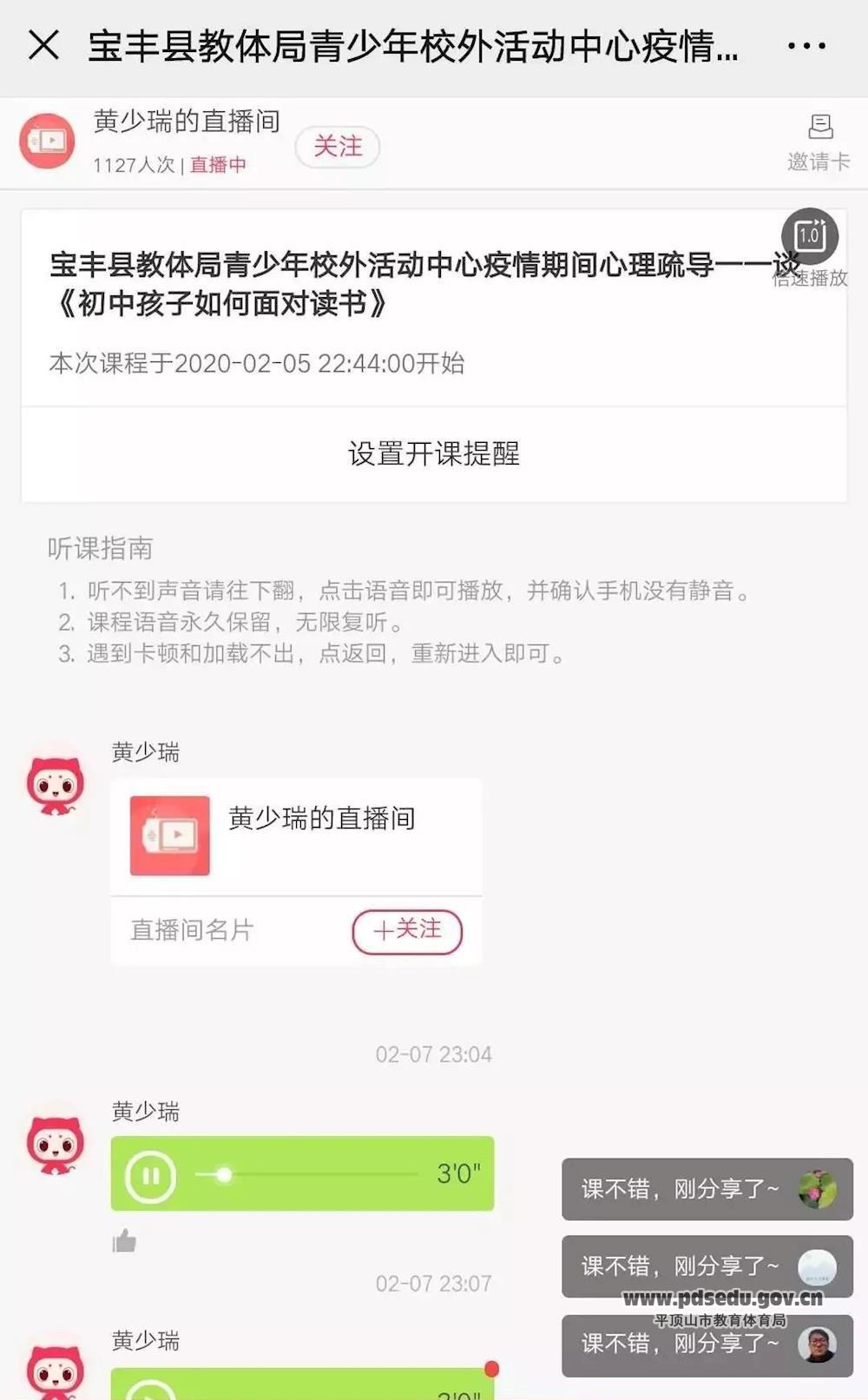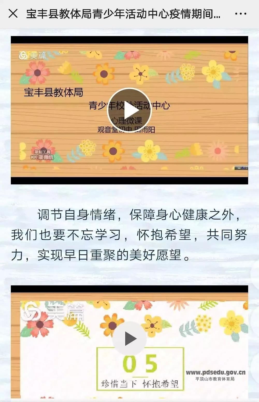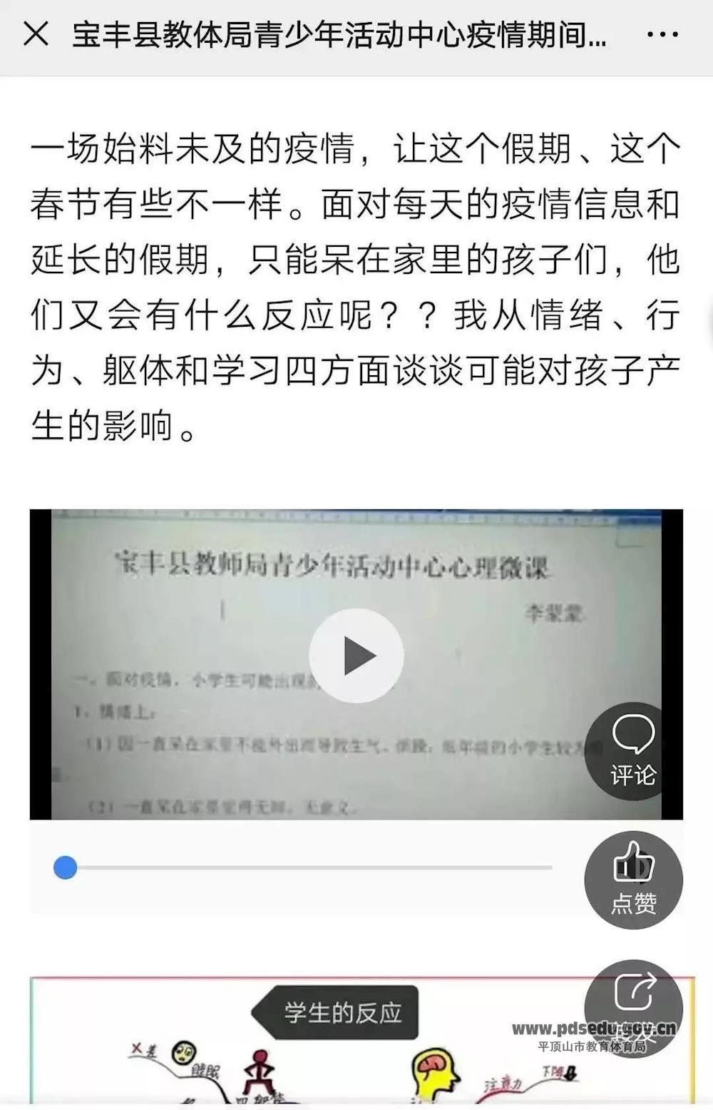 “我们除了录制文化课,还录制了包括疫情防控、体育、音乐、美术、思想政治、心理健康等课程,把育人放在重要位置,融入对学生爱国教育、生命教育、责任教育、感恩教育、规则教育、诚信教育等内容。”该局分管教研工作的杨俊锋说。“让学生观看和学习防疫阻击战中涌现的先进事迹,观看红色电影、阅读《宝丰文化系列丛书》,弘扬社会美德,增强学生爱党、爱国、爱人民、爱社会主义的思想情感”。