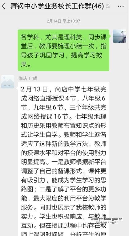 为确保线上教学实效,最大限度发挥空中课堂作用,督导室副主任郭瑞宾带领普教股、教研室等股(室)负责人亲自参加全市中小学近30个班级教学群,和各学校校长每天总结线上学习的得与失,及时调整线上学习策略和课程设置,开全课程,力求在减轻师生、家长负担的基础上,确保空中课堂实效,最终达到提高学生身心全面发展的目的。