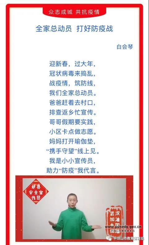 “昨日文明小天使,今天小小宣传员。新冠肺炎易感染,齐心协力来防范。听从指挥不出门,待在家里不添乱。勤通风,勤洗手,多读书,多锻炼,坚决打赢阻击战。”