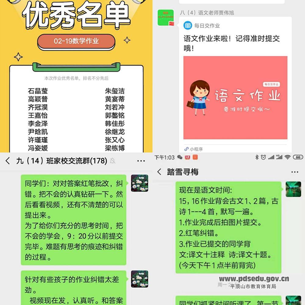 讲练结合保证质量,家校协手共促进步。为保证学生学习效果,任课老师在组织学生听微课看直播的基础上,利用微信群、小程序和钉钉软件布置、批改、评价作业,表扬先进鞭策后进,培优补差个别辅导。与此同时,学校重视家校共建工作,老师们经常与家长沟通,了解学生状况,督促学生学习。特别是对那些地处偏远山区没有上网条件的贫困学生,老师们还要通过打电话、发短信等方式单独讲课、布置检查学习任务。