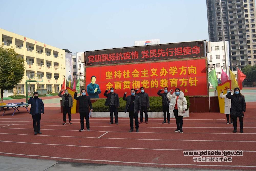 检查工作结束后,在乔永超的带领下,鲁山一中党支部班子成员和优秀党员代表一起重温了入党誓词,坚定了打赢疫情防控阻击战的信心和决心。