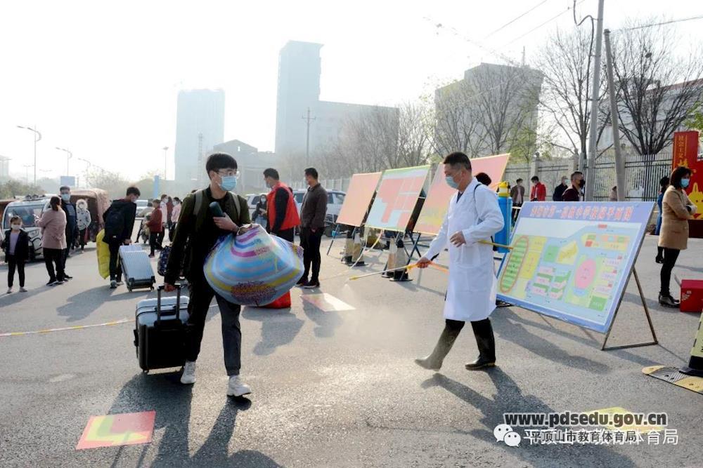 7日上午一大早,在该市一高门口看到,这里设置了五个安全通道和两个纳米银离子人体消毒通道,地上铺着消毒毯。大门东侧摆放着返校流程图和书有“战胜疫情,我们有决心!赢得高考,我们有信心!”的红色版面。公安和交警人员认真地维持秩序,消毒人员在不停地消毒。高三学生背着书包,提着行李,戴着口罩,陆续来到校门口。教师和教体局志愿者忙碌地帮他们拿行李,引导他们排队有序测量体温、登记健康信息,而后按照指定路线进入教室和寝室认座位、床位,正式开启两周的全封闭式校园生活。