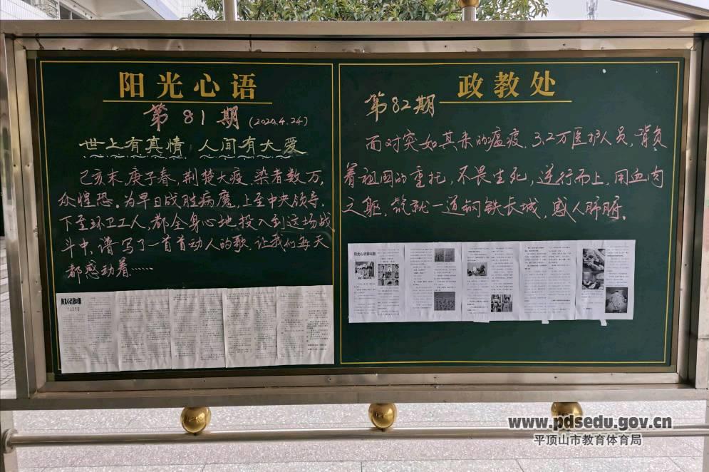 开办阳光心语专栏,加强心理健康宣传。假期里,学校心理咨询室会同办公室、班主任通过微信群、钉钉群等网络手段向师生发布官方疫情信息和应对疫情心理健康知识,鼓励大家克服恐慌心理,消除不良情绪,以积极乐观的心态投入到疫情防控和网上教育学习中去。开学后,心理咨询室又在学校显要位置开办阳光心语心理健康专栏,宣传复学后心理健康防护知识和抗疫英雄人物感人事迹,激发广大师生共克时艰战胜疫情的信心和勇气。