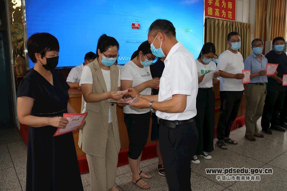 会上,宝丰二高副校长刘建国、工会主席赵东红向学习标兵表示祝贺并颁发奖品。希望受表彰的同志再接再厉,继续保持学习的积极性和主动性,深入学习贯彻习近平新时代中国特色社会主义思想和党的十九大精神,学深悟透,提升自身素质,提高工作本领。同时也希望其他教师向“学习标兵”学习,勤奋笃学、锤炼党性,将学习化为自觉行动,争做优秀教师、合格党员。