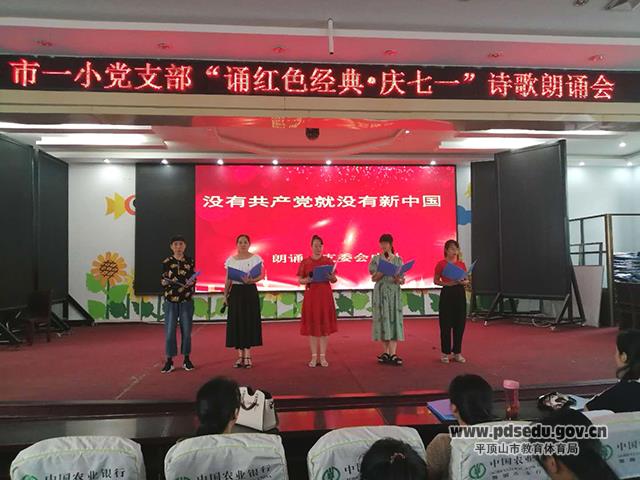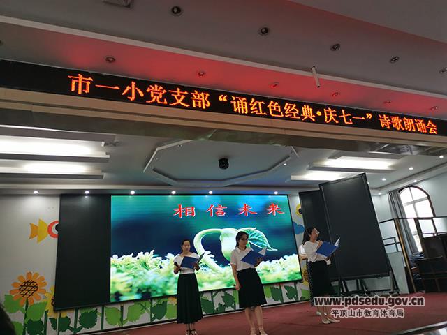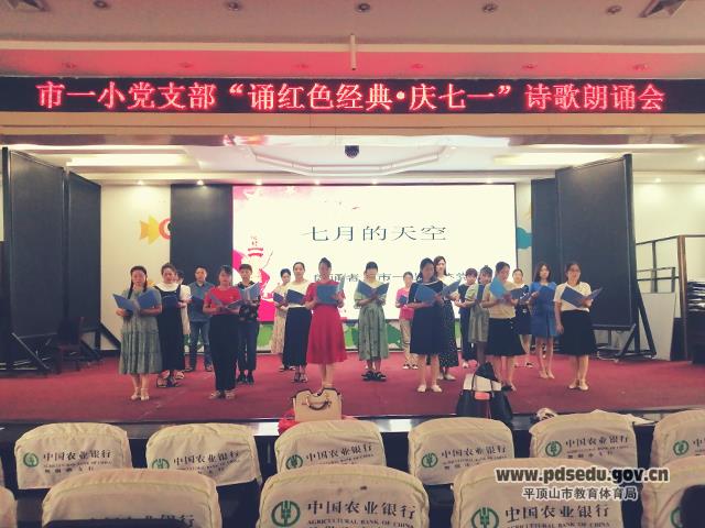 会议的最后,为了庆祝中国共产党的生日,我支部举办“诵红色经典,庆七一诗歌朗诵会”,作为对党的生日献礼。用最优美的诗篇尽情展现我们的爱国爱党的热情,向伟大的祖国、伟大的党献上我们最诚挚的祝福。支委会成员带来《有一首歌叫没有共产党就没有新中国》,党小组送上《相信未来》、《我的祖国》,全体党员献上《七月的天空》。
