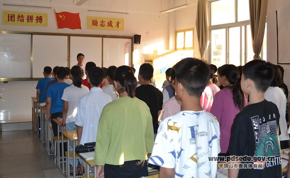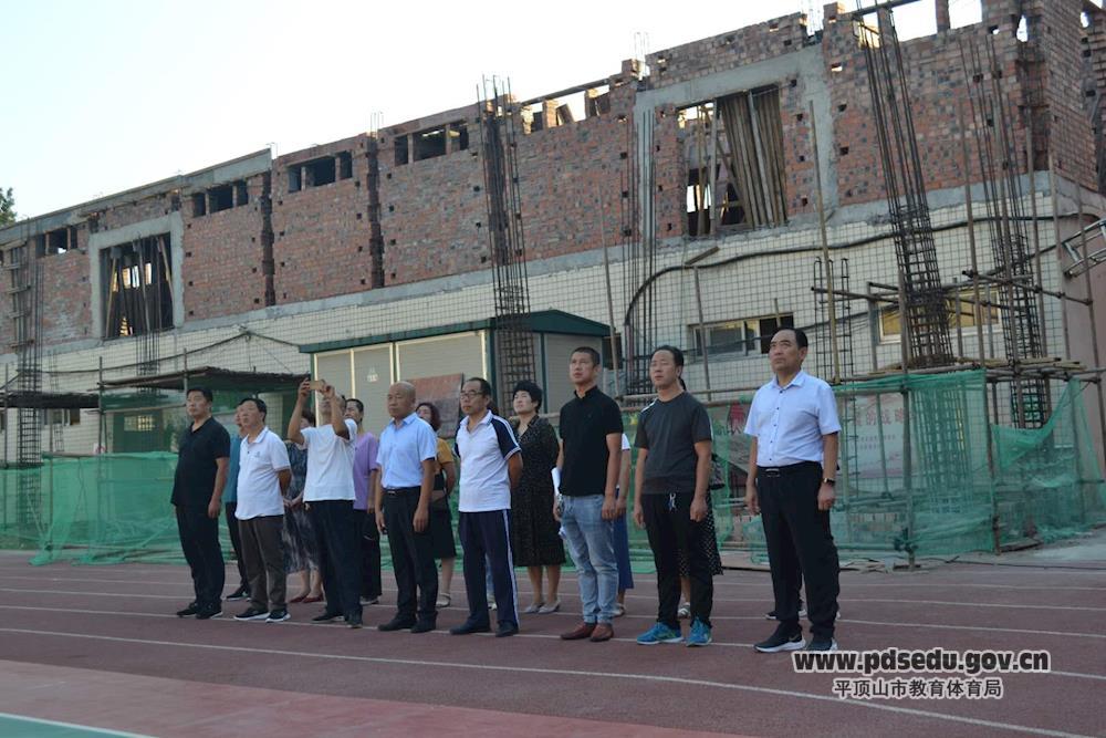 早上7时20分,旭日东升,朝霞万丈,鲁山一中全体行管处室人员在操场整齐排列。七、八、九三个年级四千余名师生在教室面向升旗台方向站立。