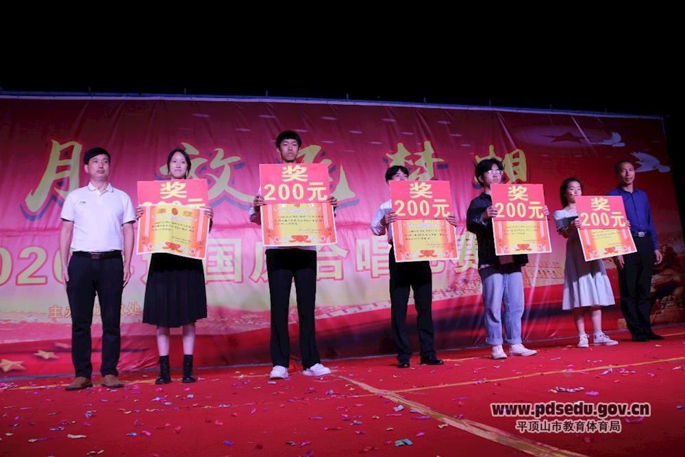 比赛分初赛和决赛两阶段,经过全体评委老师认真紧张打分,214班、215班、206班以精彩表现获得本次比赛一等奖,116班、102班、106班、212班、207班获得本次比赛二等奖,108班、109班、210班、112班、105 班、107班、209班、113班获得本次比赛三等奖。213班、208班等11个班级获得本次比赛优秀组织奖,210班、207班、206班、214班、 116班获得本次比赛优秀指挥奖,音乐艺术生群体获得本次比赛优秀展演奖。学校领导为获奖班级现场颁奖。