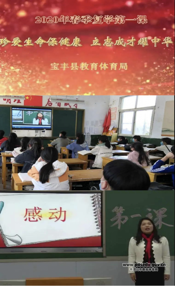 落实立德树人根本任务——创新做好“自选动作”。按照市局文件精神,为深化“把灾难当教材,与祖国共成长”主题教育活动,宝丰县教体局充分发挥思政工作骨干教师作用,集中力量、精心制作《复学第一课》——“珍爱生命保健康 立志成才耀中华”,并于复学当天组织初三学生收看。本节课在“感动”、“情怀”、“知识”、“生命”、“未来”五个关键词的引领下,配以直观生动的视频、图片,声情并茂地讲述抗疫故事,结合疫情防控教育学生努力学习文化知识。从激发感情到理性升华,从抗击疫情到学习生活,浓浓的爱国之情贯穿始终,由浅入深、环环相扣,立足眼前、展望明天,引导学生树立生命意识、坚定理想信念、涵养家国情怀、砥砺奋斗精神,努力成长为担当民族复兴大任的时代新人。