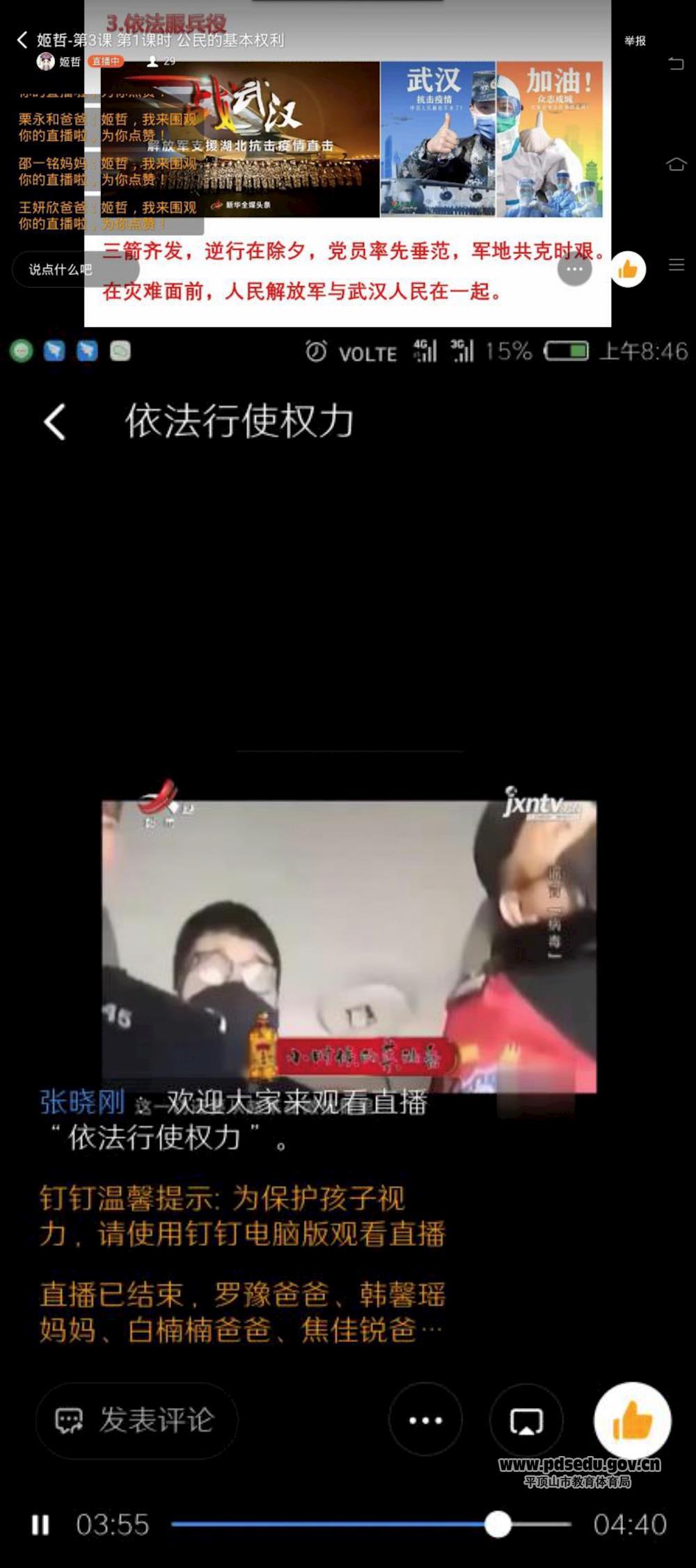 市三六联校充分发挥课堂教学主渠道作用,不断丰富教学内容,把生命意识、理想信念、科学素养、生态理念、道德责任等融入课程教学之中。3月17日,副校长董建新亲自为大家上了一节生动的思政课《把灾难当教材,与祖国共成长》,教育引导学生深刻理解社会责任和道义担当的实质内涵,增强责任感使命感。随后张晓刚主任、姬哲老师通过钉钉直播也为大家送上了《理解权利和义务》、《公民的基本义务》等精彩内容,加强价值引领,实现教书育人有机统一。