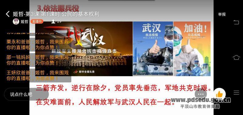我校充分发挥课堂教学主渠道作用,不断丰富教学内容,把生命意识、理想信念、科学素养、生态理念、道德责任等融入课程教学之中。3月17日,副校长董建新亲自为大家上了一节生动的思政课《把灾难当教材,与祖国共成长》,教育引导学生深刻理解社会责任和道义担当的实质内涵,增强责任感使命感。随后张晓刚主任、姬哲老师通过钉钉直播也为大家送上了《理解权利和义务》、《公民的基本义务》等精彩内容,加强价值引领,实现教书育人有机统一。