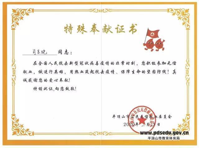 2月28日下午,念及疫情期间严峻的采血形势和紧张的血液库存,司东晓趁着工作的间隙,戴着口罩来到平顶山市区平声影剧院一旁的献血屋,伸出手臂,做了一名“逆行献血者”和“最美蒙面侠”,用一腔热血筑起抗击疫情、保障生命的坚固防线。市一中校长胡彦军了解情况后说,“司东晓老师能在关键时刻做出这样的举动,一点也不奇怪,他平时就是一名工作积极敬业、认真负责,对学生充满爱心的优秀教师,连续两年被市教体局评为优秀共产党员。”
